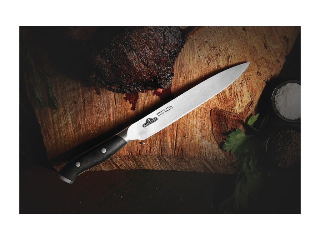Filetovací nôž vybavený čepeľou z nemeckej ocele je tenký a dlhý, takže umožní krájať tenké plátky šunky, pečienky alebo väčšie kusy mäsa. Dvojmo nitovaná ergonomická rukoväť skvelo padne do ruky.