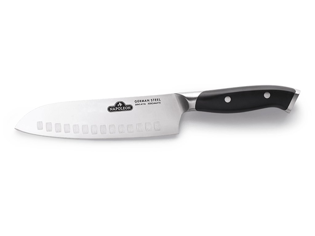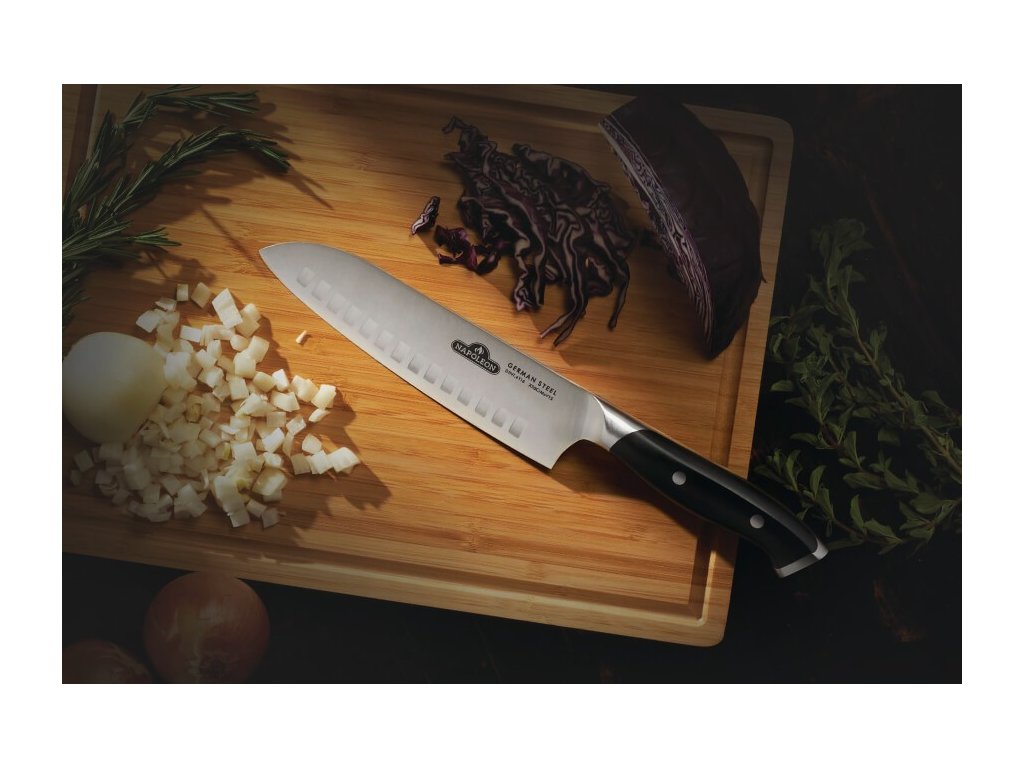 Viacúčelový nôž s čepeľou z nemeckej ocele s jamkami umožnia hladké rezanie a pohodlnú prácu. Dvojito nitovaná ergonomická rukoväť perfektne padne do ruky. Dĺžka noža je 32 cm.