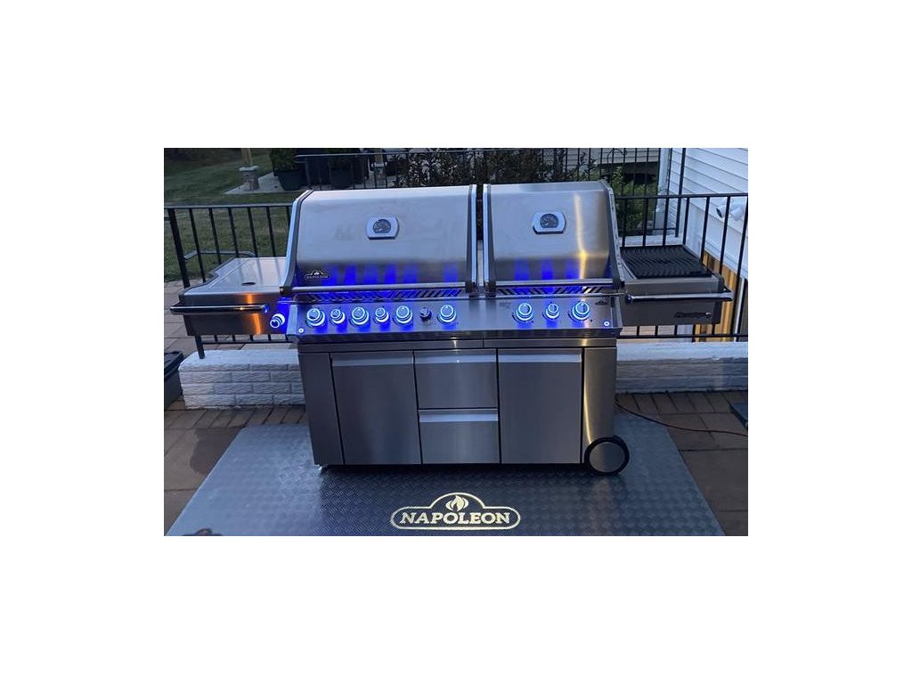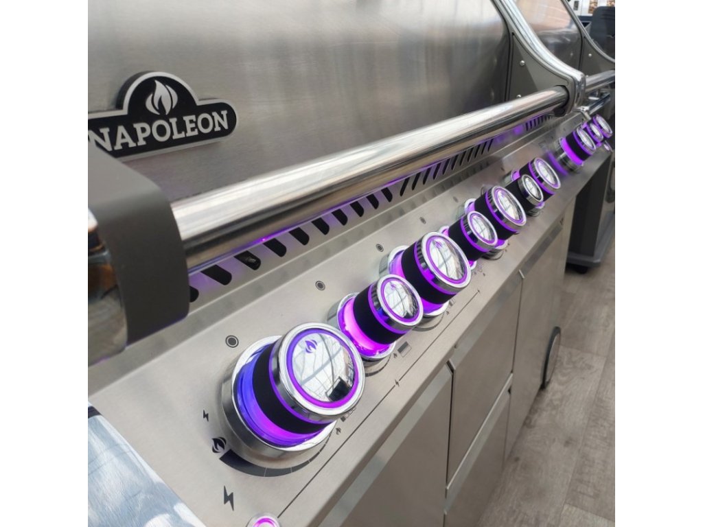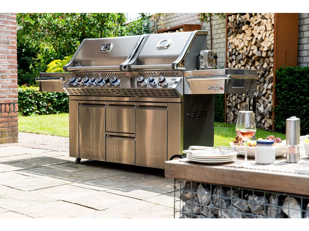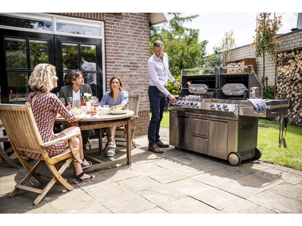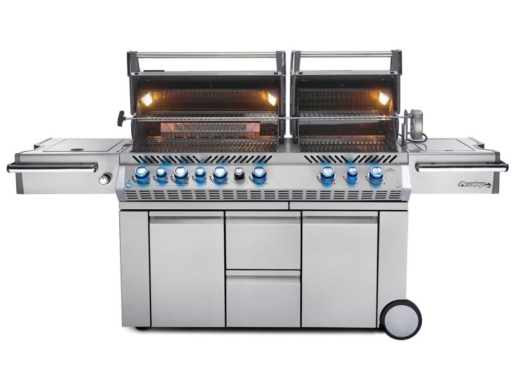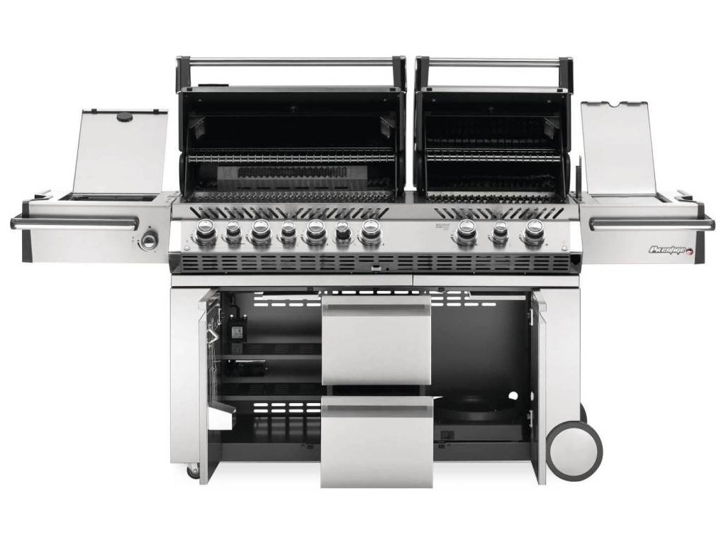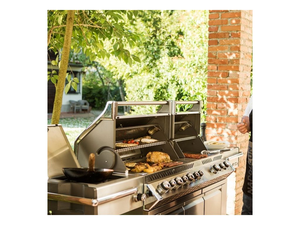 Medzi plynovými grilmi je PRESTIGE PRO 825 úplná špička. Najväčší záhradný gril z najvyššej rady grilov značky NAPOLEON®. Dvojkomorový nerezový gril ponúka hneď desať horákov. Štyri základné, zadný horák pre ražeň, dva infračervené horáky Sizzle Zone, bočnú platničku, horák na údenie a jeden samostatný ohrievací horák. To mu dáva neuveriteľný výkon 38,6 kW. Obe grilovacie plochy majú samostatné veká so vstavanými teplomermi. Milovníci údenia ocenia integrovaný zásobník na údiacu štiepku, úplne všetci ocenia veľkorysé odkladacie plochy, box na ľad s doskou na krájanie, osvetlené ovládacie gombíky, osvetlený rošt a samozrejme špeciálne zosilnený grilovací rošt z nerezovej ocele v tvare klasických vlniek WAVE™. Rozmer roštu: 72x46 a 47x46 cm