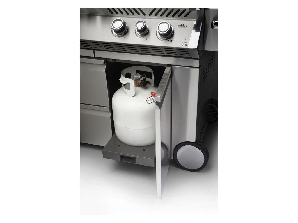 Čo si budeme rozprávať, propán-butánová fľaša nevyzerá nikdy pekne. Preto ju schovávame za dvierka, kde nájdete aj osvetlené poličky.