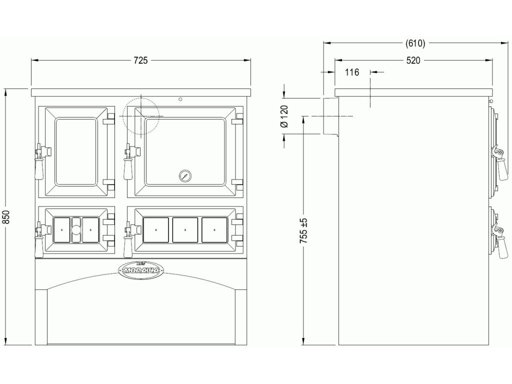 Ohnisko je tvorené silnými šamotovými tehlami a pevným liatinovým roštom. Tieto materiály sú už roky overené, sú odolné vysokým teplotám, vyznačujú sa pevnosťou, stálosťou tvarov a schopnosťou ďalej temperovať. Do ohniska je možné vkladať polená až o priemere 160 mm a dĺžke 340 mm. Trúba sporáka je smaltovaná a vo vnútri je zabudovaný drôtený program, ktorého súčasťou je kovová mriežka a hlboký pekáč. Teplomer na dvierkach trúby slúži k indikácii teploty v trúbe. Nad dvierkami trúby je umiestnená páka na ovládanie funkcie varenia a pečenia.